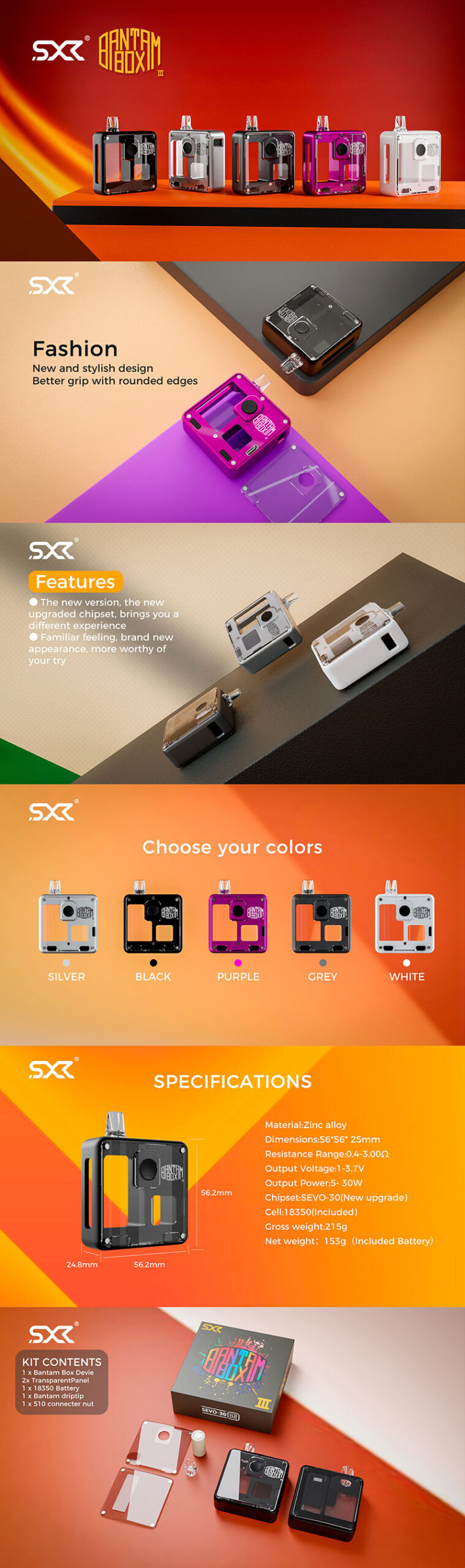 Monta un chipset SXK30 in grado di erogare una potenza massima di 30 watt, il display indica la carica della batteria, gli ohm della coil, il voltaggio e il wattaggio, presa micro-USB e può essere utilizzata con batterie 18350 (inclusa).