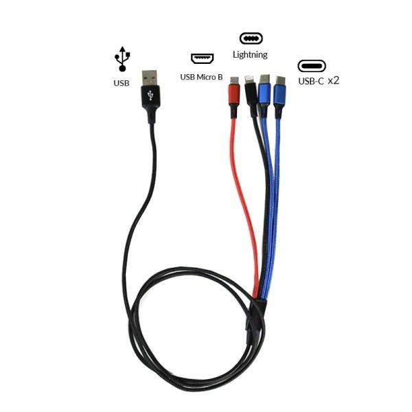 Cavo USB 4 in 1 di 125 cm con un carico di 2.8A, in grado di caricare rapidamente fino a 4 dispositivi contemporaneamente con 4 uscite diverse.