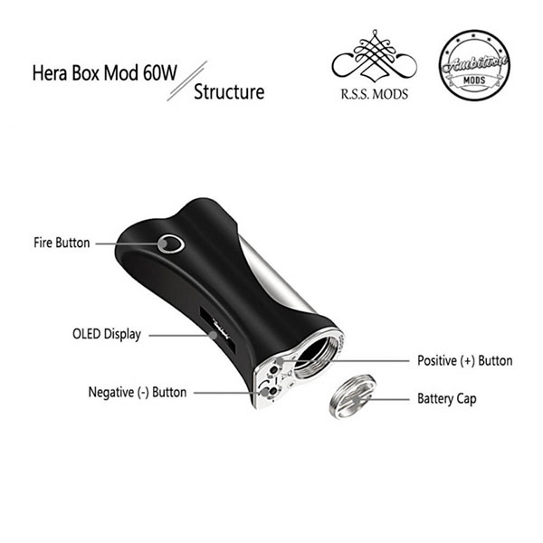 L’Hera è una box mod circuitata dal design moderno, realizzata in collaborazione tra Ambition Mods e R.S.S. Mods. Viene alimentata da una singola batteria 18650 (non inclusa) ed è in grado di erogare fino ad un massimo di 60watt.