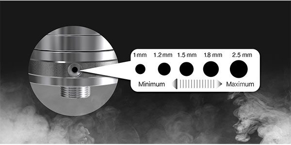 Il flusso dell’aria è regolabile grazie a 5 fori d’aria ( 1mm. / 1,2mm. / 1,5mm. / 1,8mm. / 2,5mm. )