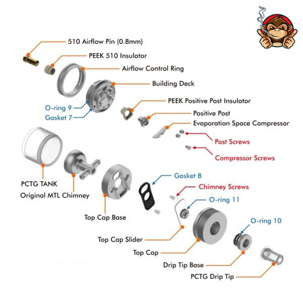 Enigma RTA di SXK in acciaio 316, tank in PCTG, diametro 22mm. Include 5 pin dell'aria per un flusso personalizzabile.