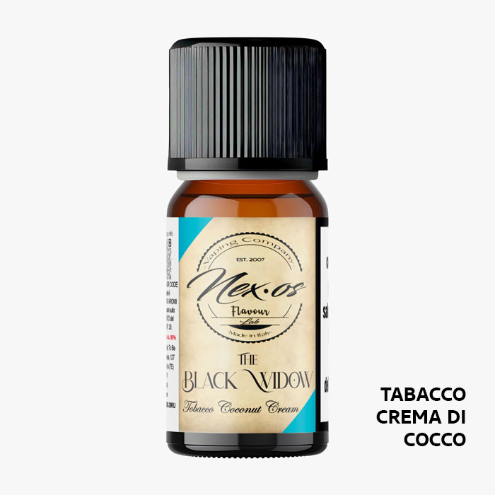 The Black Widow di Nex-Os è un aroma concentrato al gusto di Tabacco e Crema di Cocco.