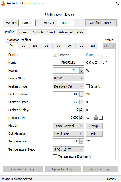 A questo punto nel campo “power” si andrà ad inserire il valore di watt minimo ottenuto nel processo di CoilWrapping su Steam Engine, mentre nel campo “Modalità” bisognerà aprire il menù a tendina e selezionare “Controllo Temp“. Alla voce “Materiale Coil“, invece, si selezionerà [TFR] con la sigla del materiale utilizzato e, cliccando su “modifica” sarà possibile caricare la tabella TFR scaricata in precedenza. Al rigo “Temperature” è consigliabile inserire la temperatura minima ricavata da steam engine nel coil wrapping. Come ultimo passaggio bisognerà poi cliccare su “Upload” per caricare il profilo sulla box.