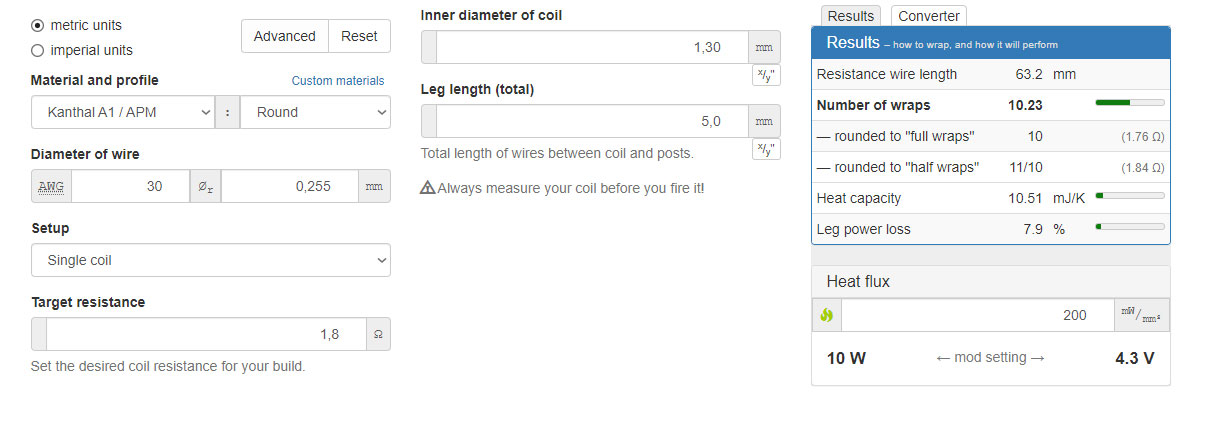 Nella sezione Coil Wrapping si inseriscono le informazioni riguardanti la coil che si andrà a creare e precisamente il materiale del filo utilizzato, il diametro, la lunghezza delle gambine ed il numero di spire. Il programma poi darà come risultati, i valori minimi e massimi di watt e di temperatura che possono essere impostati in base alle informazioni della coil inserite prima.